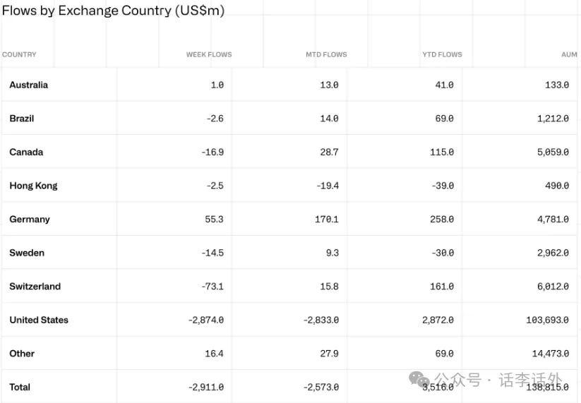 在資金流出幣種方面,比特幣上週的流出量為 25.9 億美元,以太坊為 3 億美元,Solana 為 740 萬美元,Ton 為 2260 萬美元。Sui 和 XRP 則相對錶現比較好,資金流入量分別為 1550 萬美元和 500 萬美元。而在資金流出地區方面,上週比較明顯的分別是美國(資金流出 28.7 億美元)、瑞士(資金流出 7300 萬美元)和加拿大(資金流出 1690 萬美元),與此形成比較的是,德國流入的資金為 5530 萬美元(也許是德國投資者認為上週的波動是趁機買入的機會吧)。如下圖所示。