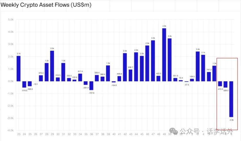 我們繼續看看資金流向方面,加密市場目前已經持續 3 周出現資金流出情況,而且上週還創下了有史以來最大的單週資金流出量(共計 29 億美元),如下圖所示。