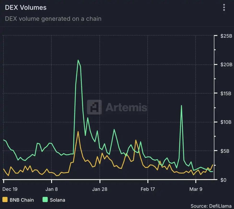 而這次 Meme Szn 帶來的效果從數據層面看也讓幣安收益頗多,首先最顯著的就是 Dex 的交易量,在這次週期中一度達到了 Solana 的兩倍。