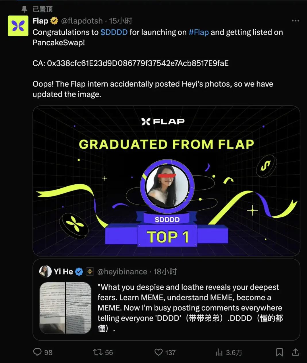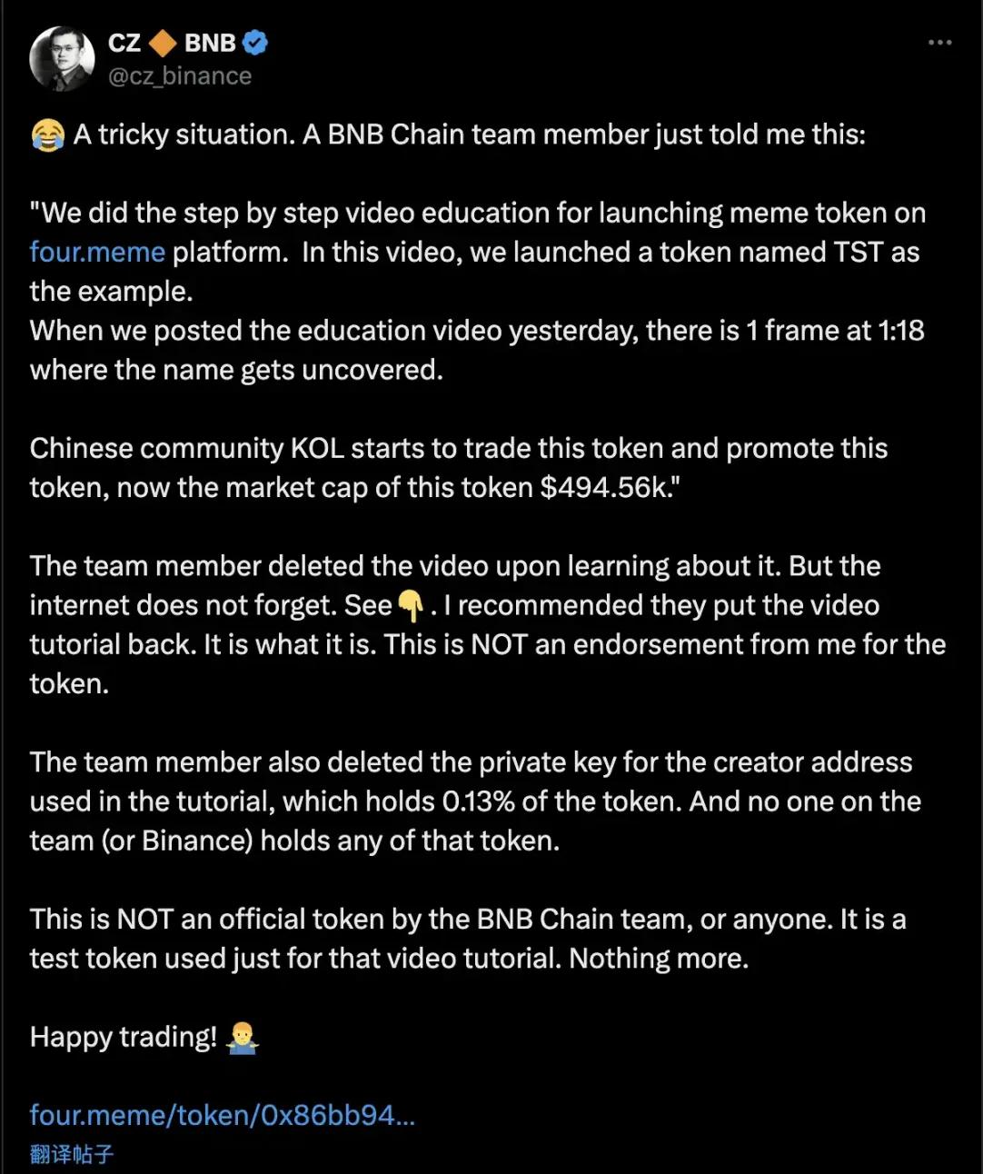 BSC 的 Meme 技巧增長可以分為三部分,2 月 5 號,BNB chain 團隊發佈了一個 Four.meme 的宣傳視頻包含了測試代幣,類似的測試代幣被市場炒作其實並不罕見,包括之前的 pumpfun 或各類 Dex 的演示視頻。奇特的是從來不玩 Meme 的 CZ 對此的態度。第二天 CZ 轉發該條視頻推文並說明了情況,而他的解決方案總結來就是一句話「Happy Trading」。