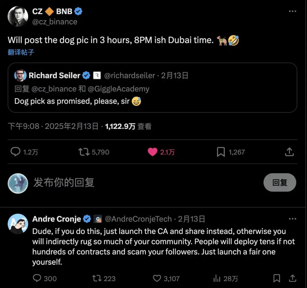 2 月 13 日上午,CZ 發推文表示,對 MEME 幣的運作機制表示好奇,詢問是否只需分享寵物名字和照片,就會有人創建相關代幣,並質疑如何區分「官方」版本。在瞭解相關機制後,CZ 表示「事情的運作方式很有趣。像往常處理重大決定一樣,我需要考慮一天左右。是尊重他的隱私,還是為了大家把狗狗信息公開呢?好吧,我可能還會和 BNB Chain 上的幾個 MEME 幣互動。」