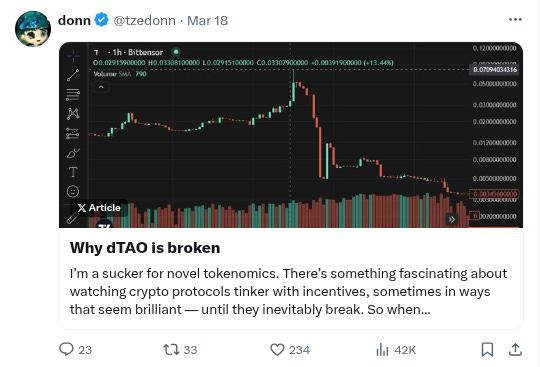 -有趣的新文章表達了對Bittensor的新dTAO模型及該專案整體方向的批評,h/t @tzedonn: