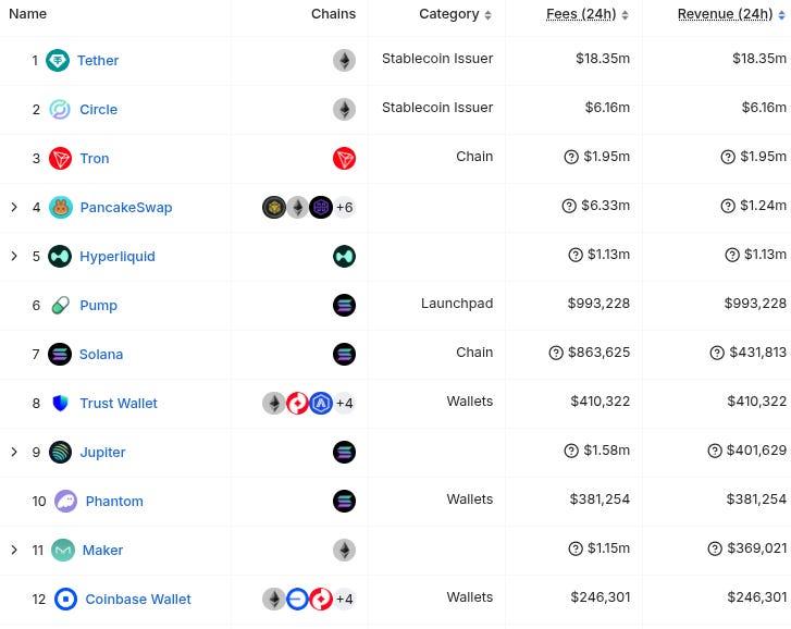 以下是24小時收益最高的實體 (來自 @DefiLlama):