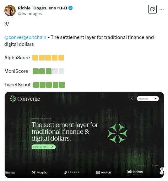 -來自Ethena的新專案叫 @convergeonchain。Twitter簡介稱"傳統金融和數字美元的結算層"。被85個我們的關注者關注。h/t @twindoges: