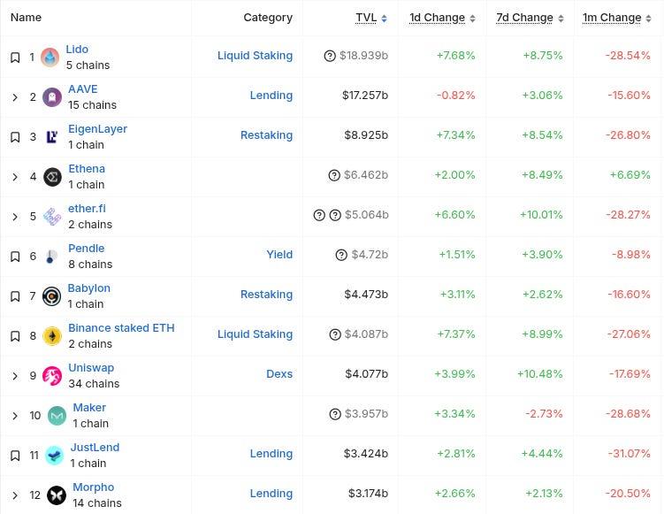 以下是TVL前12位的協議 (來自 @DefiLlama):