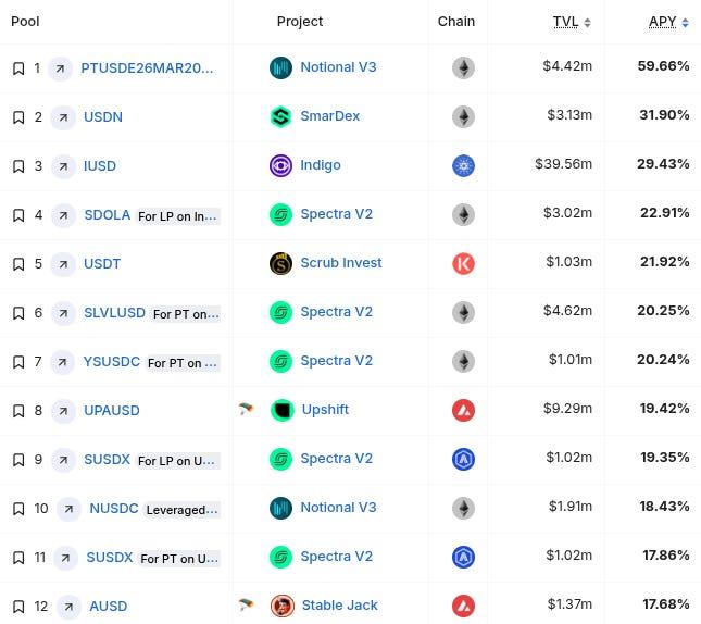 (注:這些是頂級穩定幣收益,來源於 @DefiLlama (單一敞口,無IL,TVL超過$1M) - 注:這些列表只是原始資料,請務必在與任何/所有協議互動之前自行盡職調查)