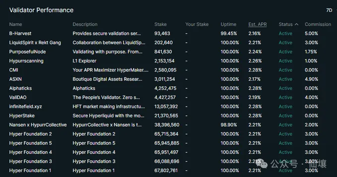 在質押層面,我們可以把 Hyperliquid 當作一個常規的 POS 鏈來看,目前官網上支持用戶去質押代幣運行 Hyperliquid 驗證者節點,系統會根據你的節點的表現來分發激勵。