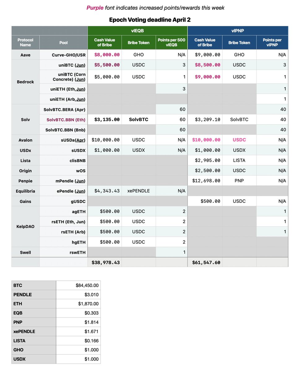 本週(4月3日)截止的 Pendle生態(@Equilibriafi + @Penpiexyz_io) 投票獎勵總整理、總獎金超過了$100K
