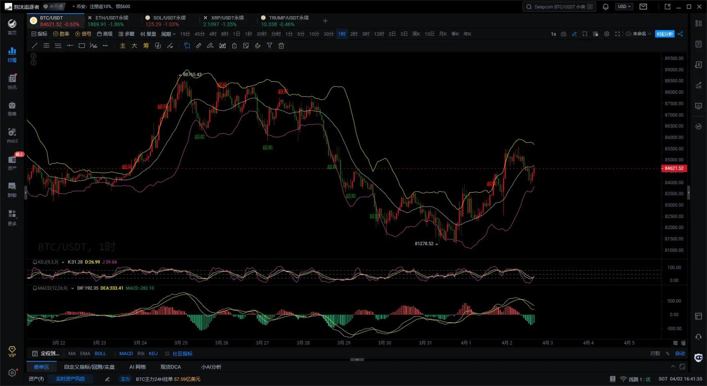 首先,根據比特幣4H級別圖中的布林帶指標來看,當前價格在布林帶中軌附近運行,並略微向上突破,說明短期內有上漲趨勢,如果價格繼續沿著上軌運行,可能會進一步上漲,但需要警惕凌晨3點的消息面帶來的風險。