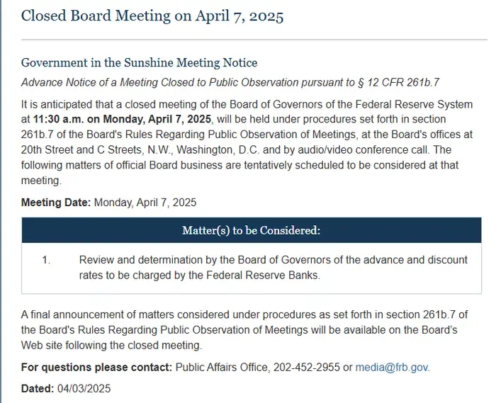美聯儲於4月7日召開閉門會議,主題為“審查預付款利率和貼現利率”,其時機引發市場猜測:是否在為關稅衝擊籌備對策?隔夜利率互換市場顯示,投資者預期年內降息125個基點,下週緊急降息概率達40%。