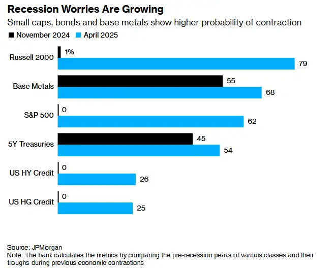 與此同時,衰退信號愈發刺耳。4月9日,摩根大通發佈報告稱,與美國經濟密切相關的股票已消化近80%的經濟衰退概率。其基於市場的衰退指標顯示,羅素2000指數在近期拋售中首當其衝,反映出的衰退可能性高達79%。標普500指數對應的概率為62%,基本金屬為68%,5年期美債為54%。