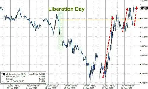 關稅升級加劇了金融市場的不穩定性。美債市場首當其衝,週二美國財政部58億美元三年期國債拍賣遇冷,交易商認購比例達20.7%,創2023年12月以來最高。10年期美債收益率升至4.3%,兩日累計上漲近30個基點。拍賣疲軟可能加劇外國投資者撤離美債的擔憂。