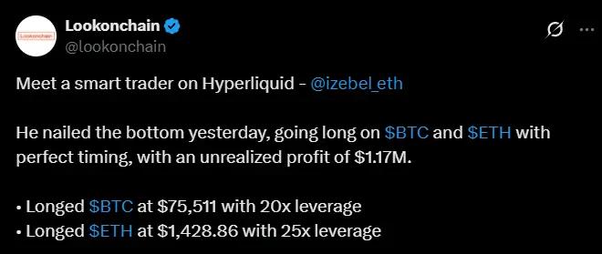 該交易者以 75,511 美元價格開設 20 倍槓桿比特幣多頭倉位,並以 1,428.86 美元價格開設 25 倍槓桿以太坊多頭倉位,目前累計浮盈約 117 萬美元。