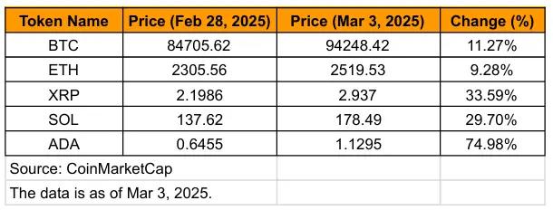 受此影響,市場對於“特朗普政府或將宣佈重大利好”的預期迅速升溫。比特幣從8.4萬美元上漲至接近9.5萬美元,特朗普所提到的幾種幣種(BTC、ETH、XRP、SOL、ADA)也在2月底至3月初期間出現明顯漲幅。下表統計了這些主流加密資產自2月28日至峰會開始前(3月3日)期間的價格走勢: