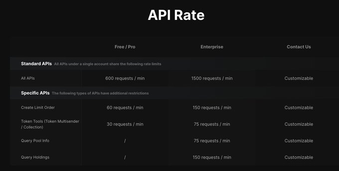 🤖DBot - 最佳的超高頻去中心化交易所交易機器人 💰企業使用者享受0.01%的交易手續費(市場上最低)。 👛單個賬戶最多可使用1,000個錢包。 🚀API速率達到每分鐘1,500次,並可進一步擴充套件。 🏖終極
