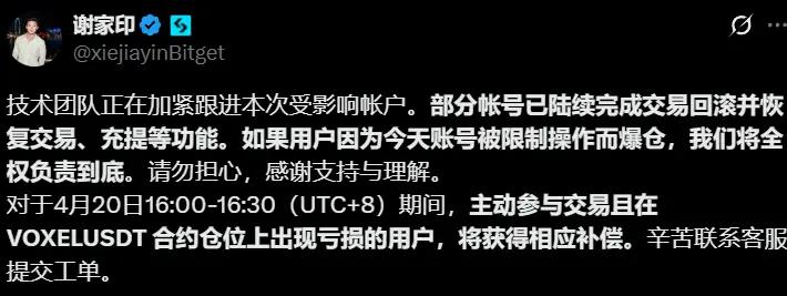 ChainCatcher 消息,Bitget 華語負責人謝家印發推表示,“技術團隊正在加緊跟進本次受影響帳戶。部分帳號已陸續完成交易回滾並恢復交易、充提等功能。如果用戶因為今天賬號被限制操作而爆倉,將全權負責到底。對於 4 月 20 日 16:00-16:30 期間,主動參與交易且在 VOXELUSDT 合約倉位上出現虧損的用戶,將獲得相應補償。”