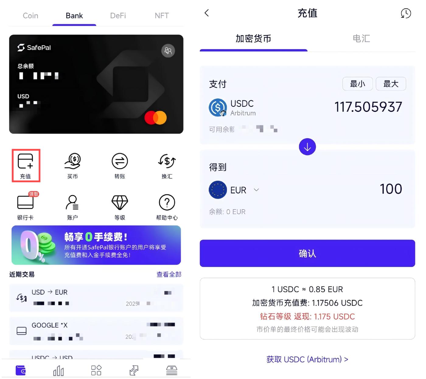 用戶可以在 SafePal 錢包 App 的「Bank」頁面中,選擇「充值」服務,將鏈上的 USDC(Arbitrum)充值為 EUR,系統會根據實時匯率把 USDC 自動兌換為歐元。