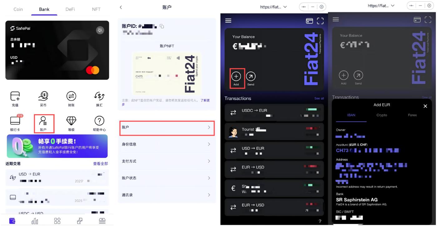 說白了,絕大部分用戶需要的不只是一張可以直接消費加密貨幣的外幣預付卡,而是一套完整、合規的金融賬戶體系。年初,筆者就深入體驗了 SafePal 與瑞士 Fiat 24 銀行合作推出的銀行通道服務。