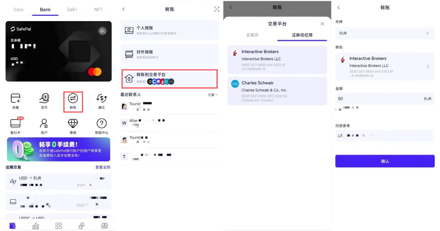 由於 SafePal 提供的個人瑞士銀行賬戶支持歐元轉賬匯款,因此用戶可以將歐元資金直接匯入支持歐元 SEPA 入金的海外券商賬戶,如盈透證券(IBKR)、嘉信理財(Charles Schwab)等,為跨境投資需求提供了一個更便捷的資金出入通道。