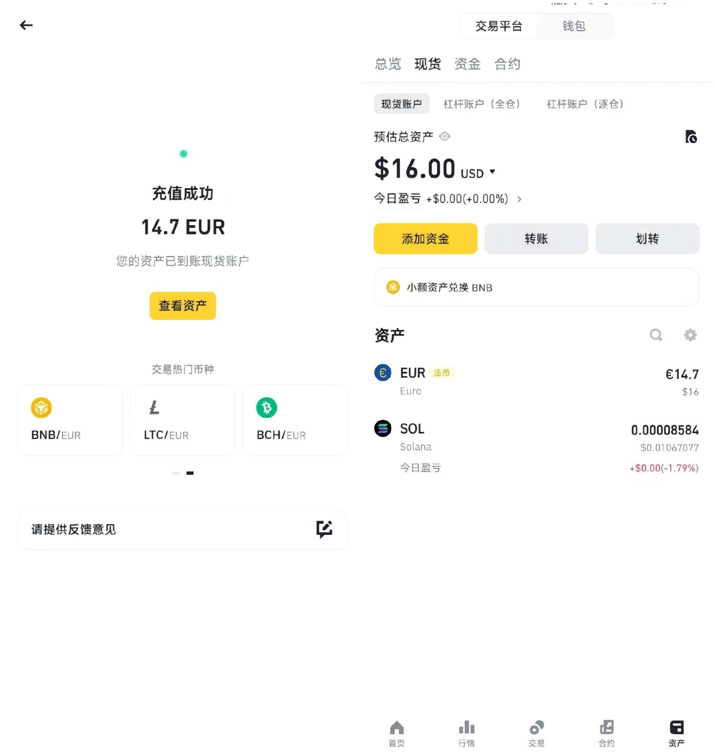 支付完成後,實測資金即可秒到賬至幣安賬戶,實現歐元(SafePal 萬事達卡)→歐元(幣安賬戶)。