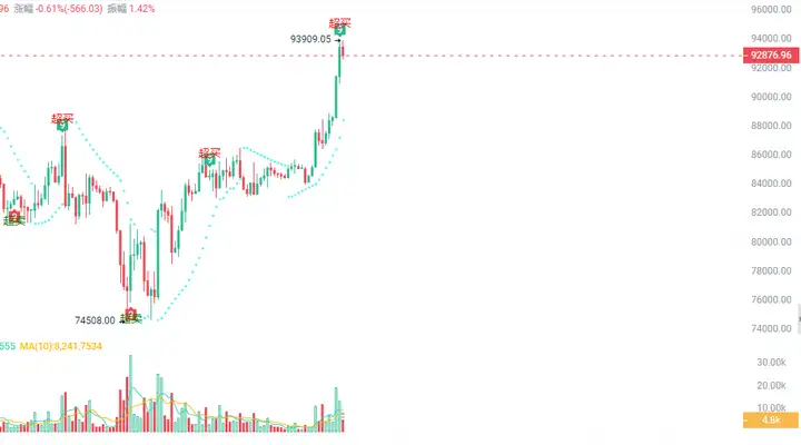 比特幣直接衝上了9.3,其實這次有點出乎意料,昨日給大家說站上8.8下一步就是9.3,以為起碼要在8.8磨兩天再往上拉,沒想到一夜觸及了。短線的9.3減倉吧,美股高開,日韓股高開,川普開不了老鮑,加上關稅問題的緩和推動了此次上漲。其實漲的不算多,但是恐慌指數卻高的很奇怪,短線先把利潤裝口袋吧,等關稅問題真正解決了以及降息信號明確了再進也不遲。