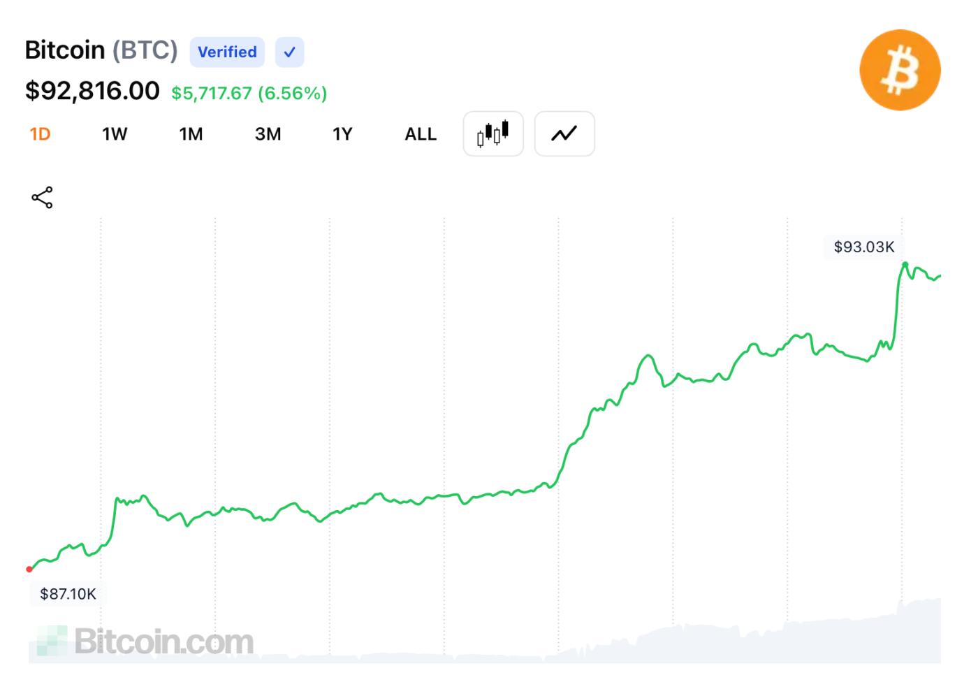 比特幣在週二晚間交易中強勢突破,重新點燃了加密貨幣市場。在東部時間下午5:45左右,這個全球市值最大的加密貨幣觸及93,928美元的最高點,相比美元上漲6.5%,過去一週上漲10.3%。
