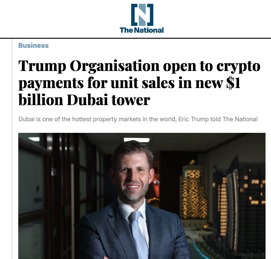 ⚡️最新訊息:特朗普組織在迪拜推出10億美元的特朗普塔專案,接受加密貨幣購買。專案包括2040萬美元的頂層豪宅和豪華公寓。 🇦🇪迪拜房地產市場繁榮,第一季度售出111套價值超過1000萬美元的住宅。