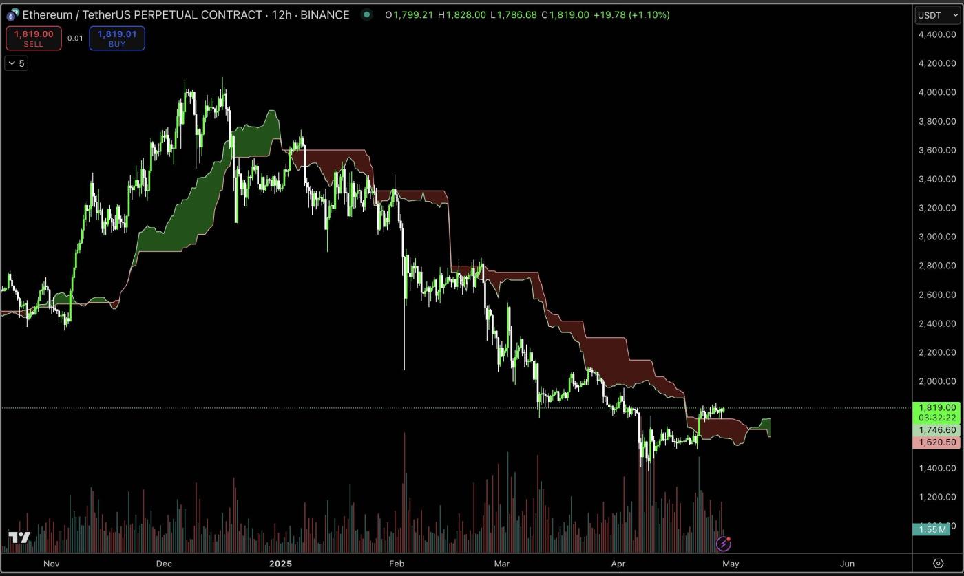 匿名加密交易員 CRG指出,ETH 價格首次自 2024 年 12 月以來恢復到 12 小時 Ichimoku 雲指標之上。Ichimoku 雲表明,當價格高於雲且雲變綠時,顯示出上升趨勢,表明看漲情緒。