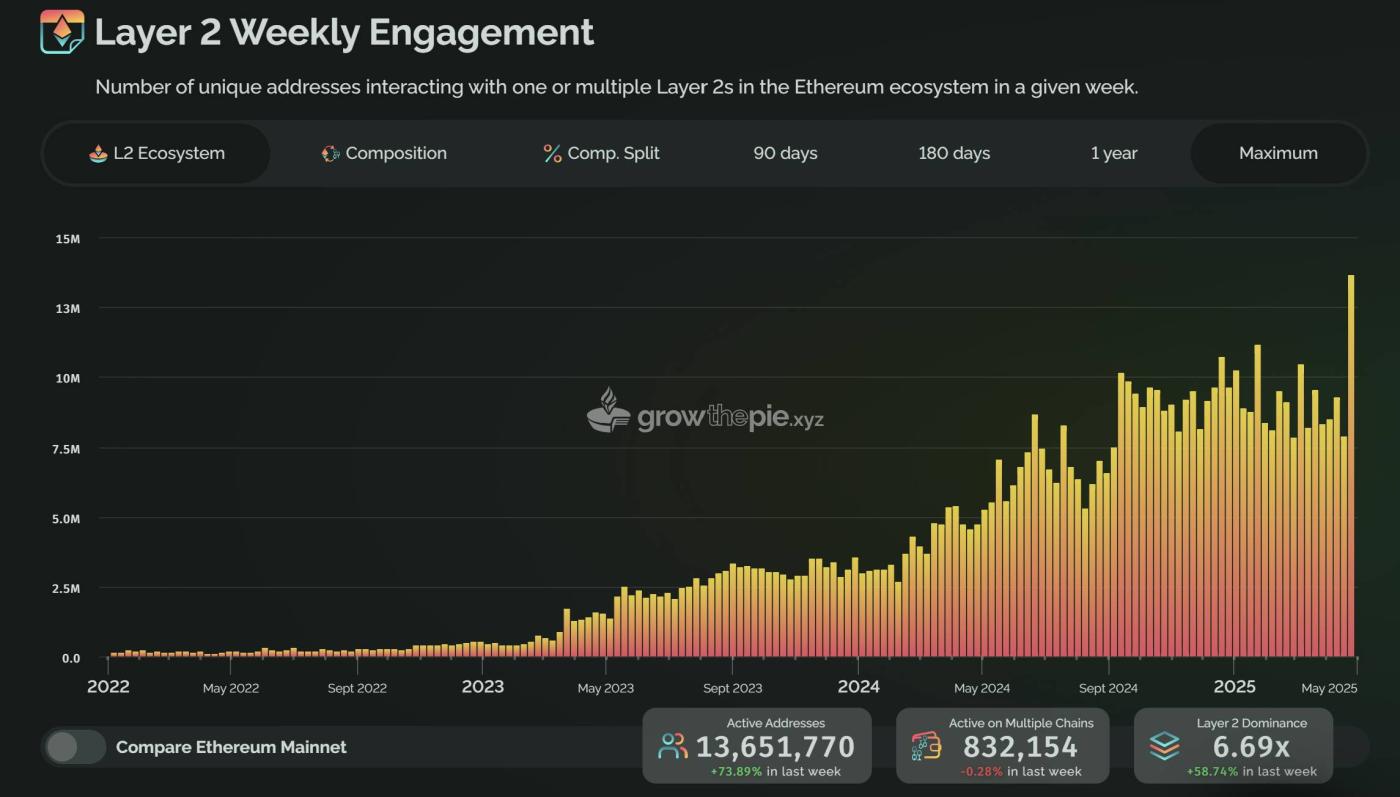 來自growthepie.xyz 的數據表明,與以太坊生態系統中的一層或二層網絡互動的獨特地址數量達到 1360 萬的歷史新高。活躍地址的比例在過去一週上漲了 74% ,這意味著網絡的可擴展性和不斷增長的採用。