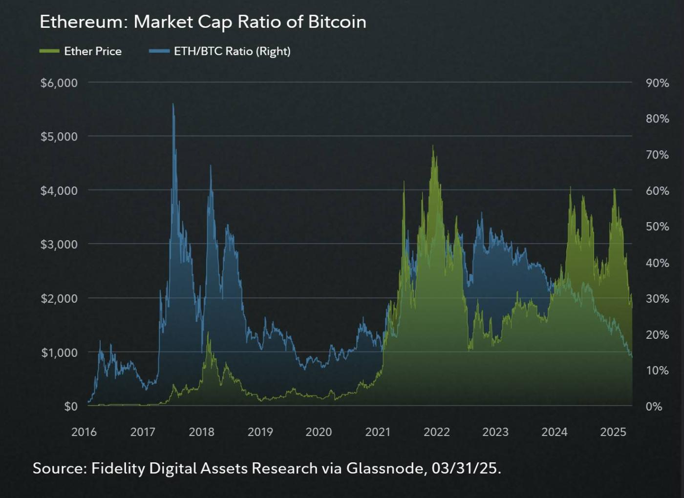 來自 Fidelity 數字資產的新數據暗示對以太坊持謹慎樂觀態度,表明其在第一季度的糟糕表現可能是一個機會。根據他們最新的《Signals Report》,以太幣(ETH)在第一季度下跌了 45% ,抹去了其在美國大選後達到的收益,此前在 1 月份達到 3579 美元的峰值。
