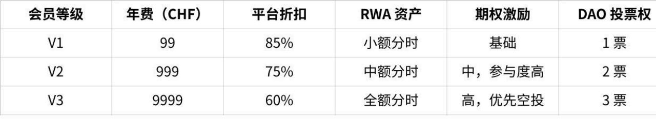 Coinsidings 建立了瑞士法郎計價的三檔會員等級(V1 99 CHF、V2 999 CHF、V3 9999 CHF),會員不僅享受平臺全站折扣,還可解鎖 RWA 資產份額、期權激勵與 DAO 治理權。