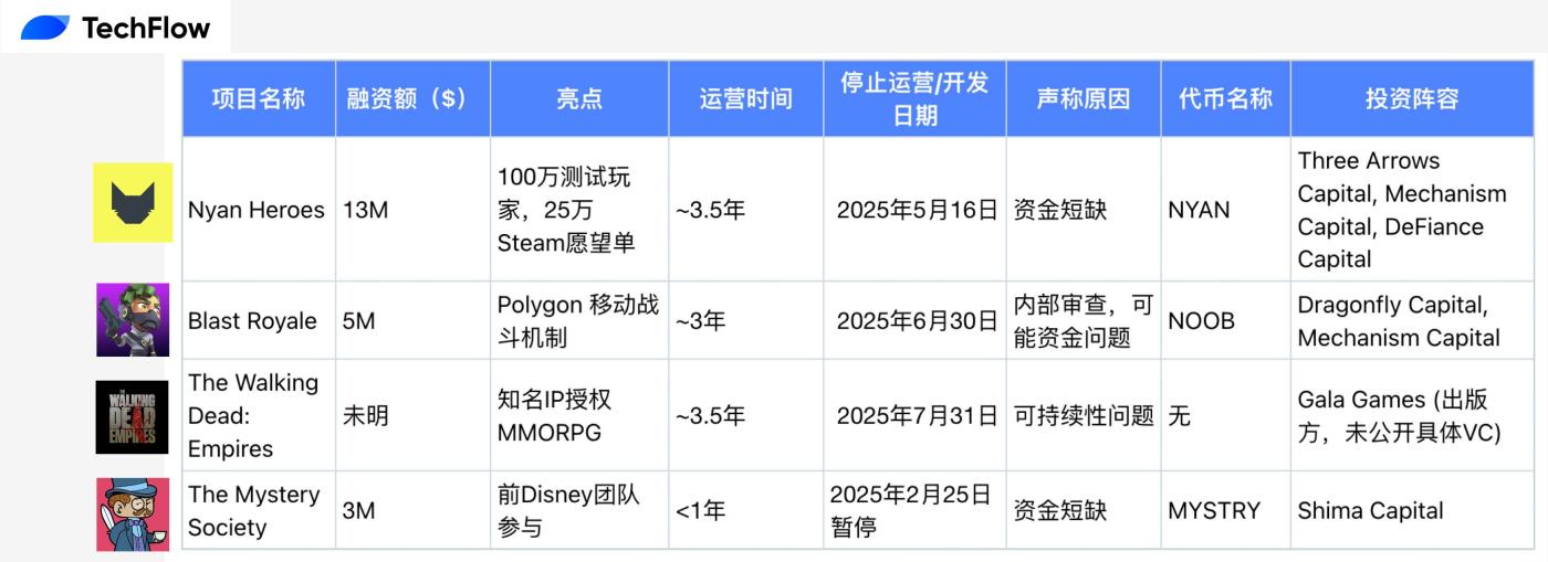 無獨有偶, 2025 年,Blast Royale、The Walking Dead: Empires、The Mystery Society 等多個鏈遊項目接連宣佈停運或暫停開發。