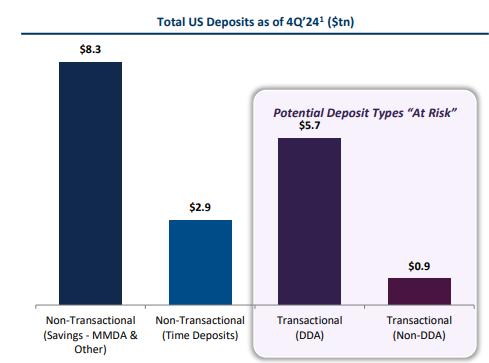 截至 2024 年第四季度,美國的總存款規模達到 17.8 萬億美元,其中非交易型存款(包括儲蓄賬戶和定期存款)佔據主要部分,分別為 8.3 萬億美元 和 2.9 萬億美元。交易型存款則包括活期存款(5.7 萬億美元)和其他非活期交易存款(0.9 萬億美元)。