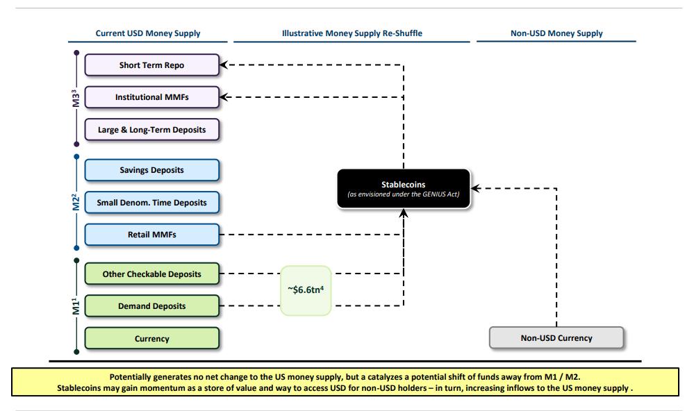 穩定幣的增長可能不會直接改變美國貨幣供應的總量,但會導致資金從 M 1 和 M2 中轉移。這種轉移可能會影響銀行的流動性和傳統存款的吸引力。