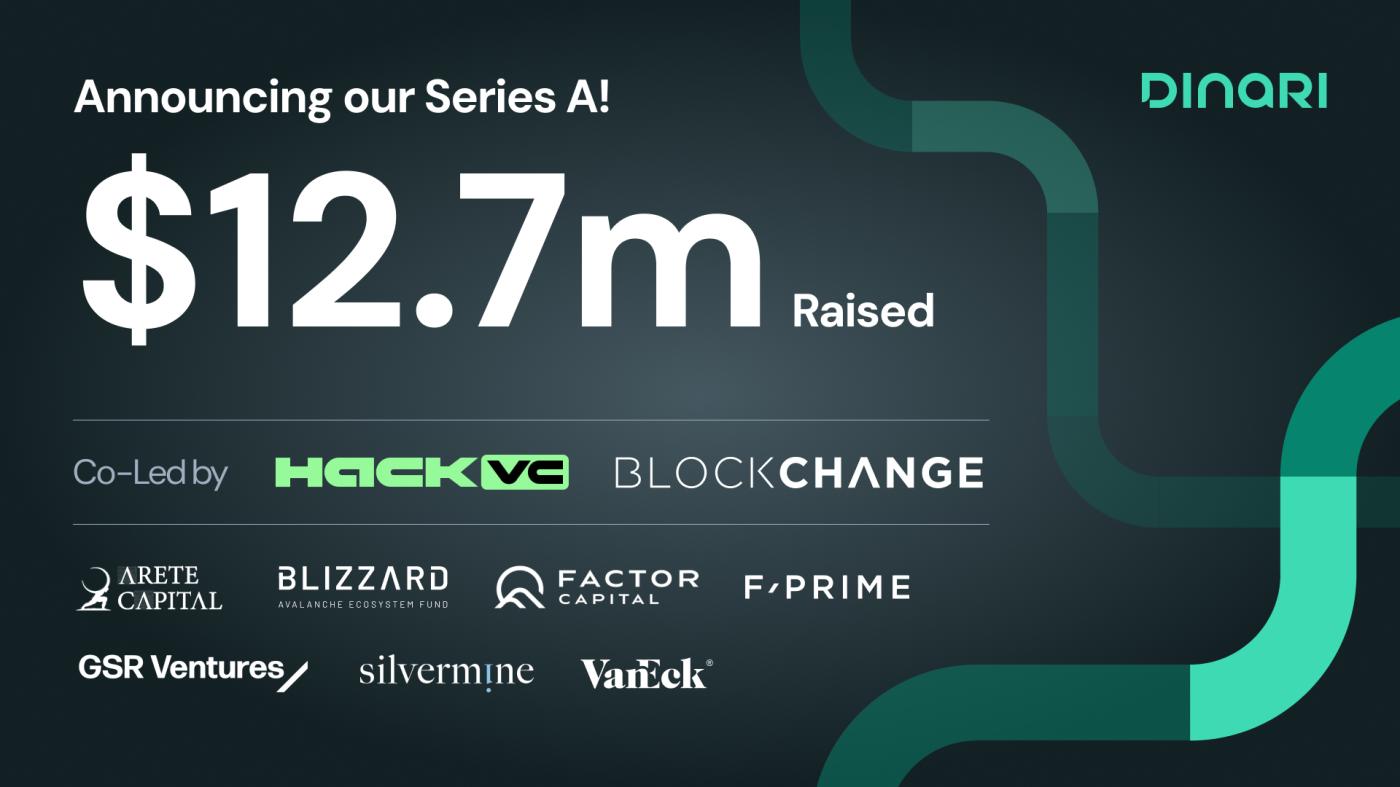 Dinari 明確表示將不會推出 Dinari 代幣。2025 年 5 月 1 日 Dinari 完成 1270 萬美元的 A 輪融資,由 Blockchange 和 Hack VC 領投,Blizzard Fund、VanEck、F-Prime Capital、Factor Capital、Arete Capital、金沙江創投、Silvermine Capital 參投。