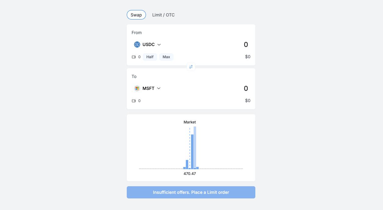 Swarm 是一個為代幣發行、流動性和交易提供合規的 DeFi 基礎設施,同時用戶可通過其推出的 DEX dOTC交易美股代幣和黃金,包括 AAPL、NVDA、MSFT、COIN 和 TSLA 等 12 種美股代幣。Swarm 支持用戶在以太坊主網、Polygon 和 Base 上使用 USDC 等穩定幣購買美股代幣,交易費用設定為 0.25% 。