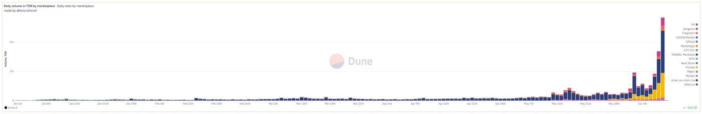 NFT 交易市場的比拼中,目前最大的 TON NFT 交易市場 TONNEL 在過去 2 日內的日交易額均超越了 OpenSea。而其它的 TON NFT 交易市場如 Portals、Getgems,其成交額在過去 2 日內也與 Blur 和 Magic Eden 不相上下。考慮到 TON NFT 市場只有 TON 鏈而 OpenSea 等支持多鏈,完全可以說 TON 在 NFT 市場上一枝獨秀。