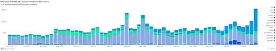很長一段時間內,鏈下成交額相比鏈上都佔據了壓倒性的優勢,往往會接近 10 倍。但在最近幾日,鏈上市場的交易額也開始增長,差距有所縮小,這可能是加密用戶開始更多進入的標誌之一