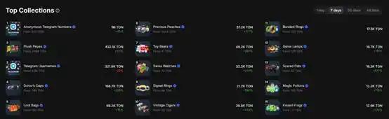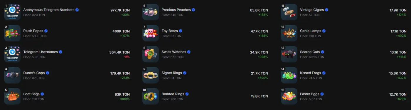 所有成交額上了周榜的 Telegram「禮物」系列,在上圖中都是一片上漲。龍二的位置很難說,從成交額和地板價看目前是 Durov's Caps,但也不排除會有後來居上者。