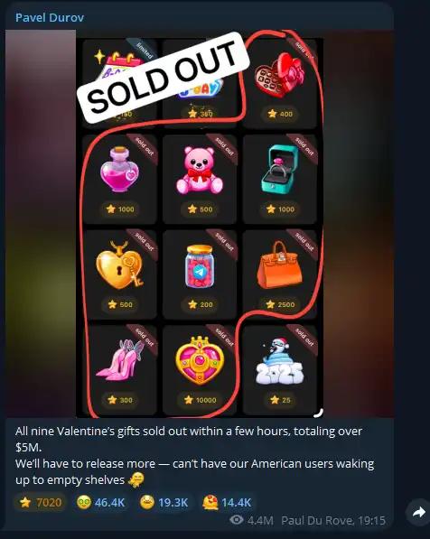 2 月 14 日,Telegram 又推出了 9 款新的限量「禮物」系列,幾小時內售罄,銷售額超過了 500 萬美元。