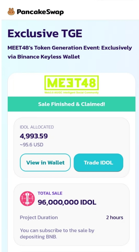 昨天幣安的Alpha沒有領,今天吃了3個,Resolv 賣了147刀,home賣了83刀,@MEET_48 的打新超募接近192倍,賣了95刀,一下子扣了45分,估計很長一段時間吃不到了 參與過之前活動的可以去查下自己的MEET48空投 http:/airdrop.meet48.com 因為Alpha分數不夠沒參與上MEET48 打新的,可以去官網做任務,也可以拿到代幣獎勵 passport.meet48.com 關於 MEET48 MEET48主打AI+娛樂+粉絲經濟,被認為是目前全球規模最大的 Web3 應用項目團隊之一 還可以養成 AI 偶像,通過創作和互動賺收益 MEET48代幣經濟學 總供應量:48 億$IDOL 社區激勵:45.2% 兩輪預售:7% 團隊:17% 流動性:3% 生態:20% 營銷:5.8% IDO:2% 後邊還有 1.92 億 $IDOL 空投,具體的規則還沒出來,可以蹲一波