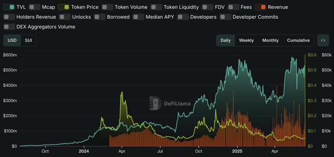 🟢 TVL:對 DeFi 協議而言最重要數據之一,圖中可看出 (綠色線) 前陣子剛創出新高,目前約為 5 億美金,在 @SuiNetwork 生態排名第二