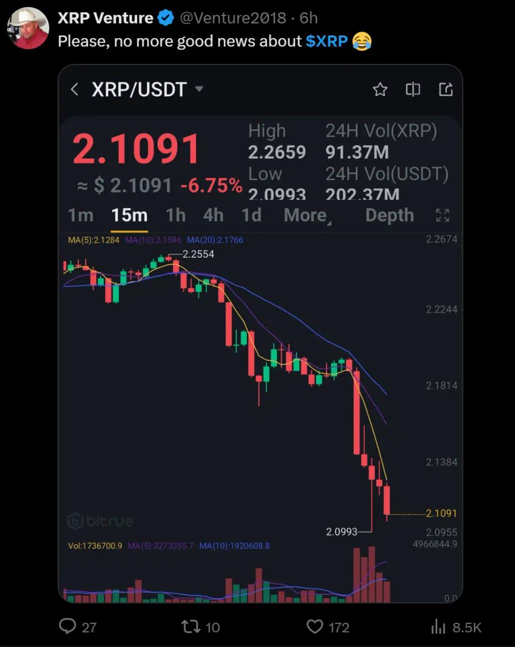 這一情緒落差,在社交平臺上表現得尤為明顯。面對接連不斷的利好,有用戶無奈留言,「別再有好消息了,幣價又跌了」。這句戲謔式評論,在一定程度上捕捉了 XRP 社區當下的真實處境:建設不斷,情緒不漲;結構演進,市場未感。