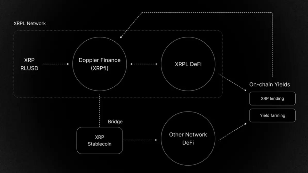 基於這些底層更新,一種被稱作「XRPFi」的新型鏈上金融結構開始成型,其核心目標是在 XRPL 原生鏈缺乏質押與收益機制的背景下,為 XRP 注入新的鏈上效用。其中,Doppler Finance 是目前最具代表性的項目之一,採用託管與鏈上並行的雙路徑架構,向持幣者提供收益產品與資產管理接口。根據官方數據,平臺當前 TVL 超過 3000 萬美元,資金通過合規託管渠道運行,支持用戶查看資產流向與收益來源。
