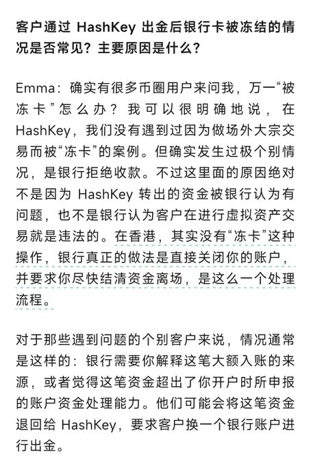 客戶通過 HashKey出金後銀行卡被凍結的情況是否常見?主要原因是什麼? Emma:確實有很多幣圈用戶來問我,萬一“被凍卡”怎麼辦?我可以很明確地說,在 HashKey,我們沒有遇到過因為做場外大宗交易而被“凍卡”的案例。但確實發生過極個別情況,是銀行拒絕收款。不過這裡面的原因絕對不是因為HashKey轉出的資金被銀行認為有問題,也不是銀行認為客戶在進行虛擬資產交易就是違法的。在香港,其實沒有“凍卡”這種操作,銀行真正的做法是直接關閉你的賬戶,並要求你儘快結清資金離場,是這麼一個處理流程。 對於那些遇到問題的個別客戶來說,情況通常是這樣的:銀行需要你解釋這筆大額入賬的來源,或者覺得這筆資金超出了你開戶時所申報的賬戶資金處理能力。他們可能會將這筆資金退回給 HashKey,要求客戶換一個銀行賬戶進行出金。
