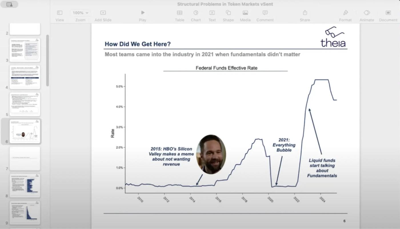 Felipe:我們是如何走到這一步的?很大程度上是因為 2020-2021 年的「萬物泡沫」時期。當時全球利率幾乎為零,大規模的貨幣增發和財政刺激,導致代幣價格上漲無需基本面、收入或現金流的支撐,也無人談論資本成本。行業從那個時期吸取了錯誤的教訓。泡沫破裂後,市場參與者在過去幾年裡一直在等待下一個「大週期」,即基本面再次無關緊要,所有代幣都能無理由上漲的時期。但隨著時間推移,人們逐漸意識到需要給投資者一些實質性的東西,他們才會購買你的代幣。直到現在,我們才開始真正面對這些棘手的問題,比如項目的收入和基本面。