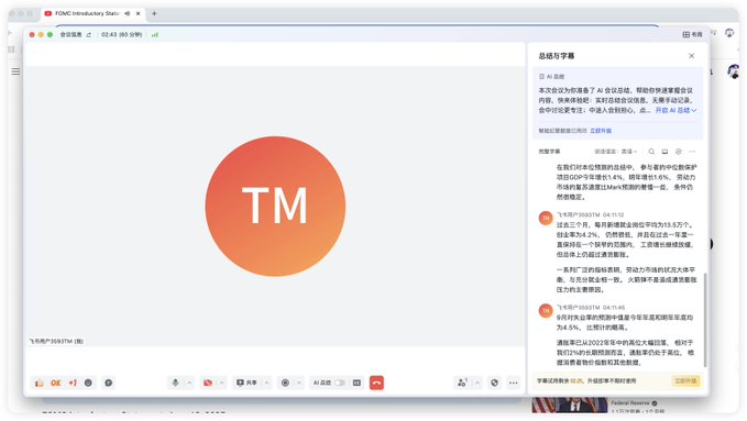 非常好用,感謝 @butaidongjiaoyi 如果我不懂,我體驗了一下飛書,是真的很好用,測試了翻譯鮑威爾的講話,準確率已經是挺高了,配合自己的認知理解到八成左右應該是沒問題的。 下載飛書,然後簡單註冊,打開左側的更多,選擇視頻會議,然後選擇發起會議,需要打開麥克風,如果沒有麥克風的小夥伴需要有語音輸入的設備才可以,重點是需要讓飛書聽到播放的聲音。 這時候打開你需要翻譯的英文視頻,保持打開狀態就可以,播放出聲音。 然後點擊飛書右下角的 CC 按鈕,激活右側的側邊欄,這時應該只有英文,選擇右側第三個 A 的按鈕,選擇中文,就可以在很短的延遲中獲得中文信息,可以是全部中文,也可以是中英文的。 唯一的缺點就是要收費,699 CNY 一年,這個價格並不算高,也就是100美元,如果覺得這個價格高的話,也可以選擇金十財經的同聲傳譯功能,這個功能大概是 30 人民幣一個月,我記得不清楚了,也可以翻譯一些重點內容,但是準確率相對來說會低一些。 再次感謝 如果我不懂 真的幫了大忙了。