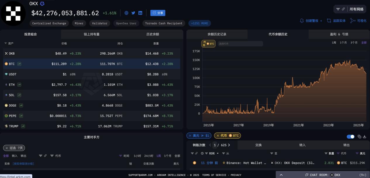 但與之相對的是,據 Arkham Intelligence 數據顯示,OKX 交易所錢包持有的 BTC 數量整理呈現上升趨勢:自 2019 年 4 月起迅速增長,並在 2023 至 2024 年間維持在高位平臺;但從 2024 年中至 2025 年有所回落,這一變化也與其他交易所 BTC 餘額的走勢形成相互印證。截至 7 月 10 日,OKX 錢包當前持有 BTC 數量為 11 萬+枚。