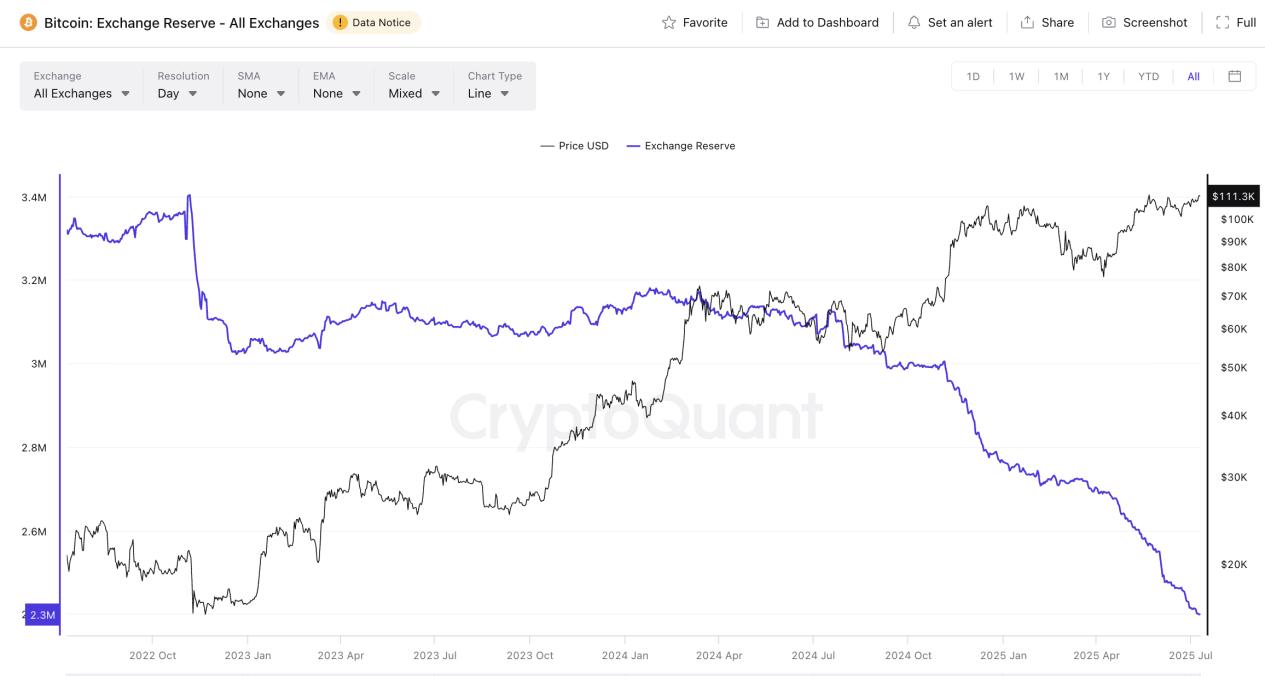 據 CryptoQuant 數據,截至 2025 年 7 月,中心化交易所持有的 BTC 餘額已降至約 240 萬枚,佔比特幣流通總量的約 12% ,創下近四年新低。自 2024 年初以來,該指標持續下行,並在 2025 年第二季度出現加速回落,與 BTC 價格的上漲趨勢形成鮮明對比,呈現出典型的牛市特徵:交易所“出金潮”往往預示中長期上漲結構的確立。
