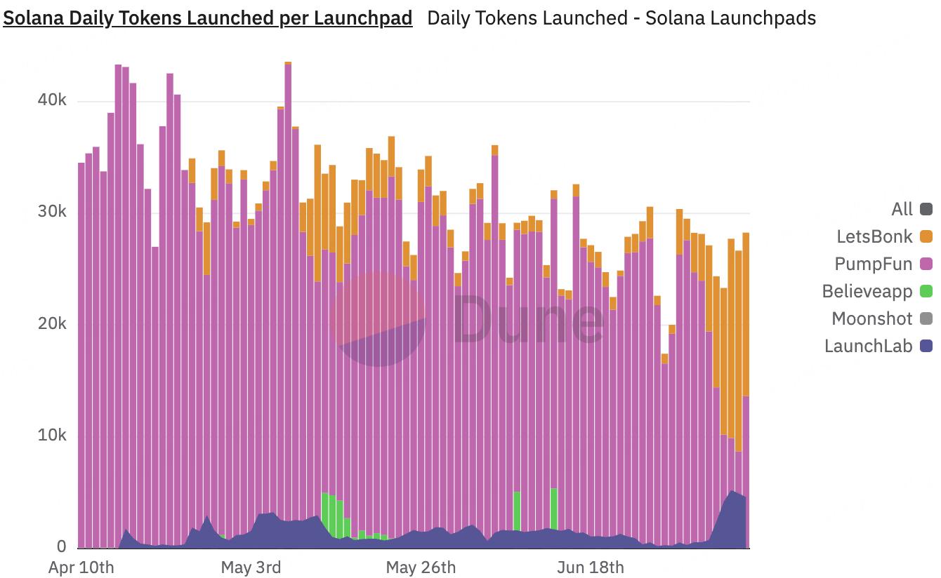 自 2024 年 1 月上線以來,Pump.fun 已累計收入近 6.7 億美元,其中單日手續費峰值則接近 700 萬美元 。這曾讓其一度壟斷 Solana 生態 MEME 代幣發射平臺的霸主地位。然而,就在 PUMP 即將發行之際,競爭對手 letsbonk.fun 強勢崛起。letsbonk.fun 以 15, 600 次代幣發行超過 Pump.fun 的 11, 500 次,以 49.8% 的市場份額顛覆前者 40.9% 的壟斷地位,這是自 2024 年 1 月以來,Pump.fun 首次在 Solana MEME 市場份額上被對手超越。儘管隨後 Pump.fun 重新回到市場第一的位置,但這次被超越的經歷引發了市場對其壟斷地位的質疑,也顯示出其在短期內存在被其他平臺替代的可能性。
